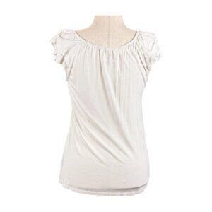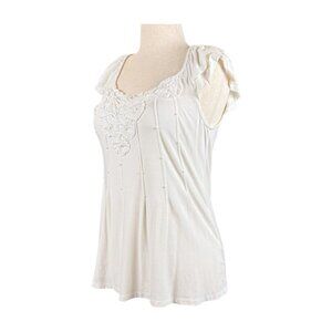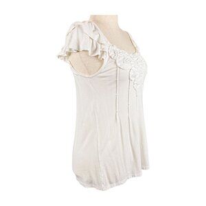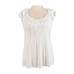 INC White Layered Ruffle Short Sleeve Top with White Beaded Flowers, Size M