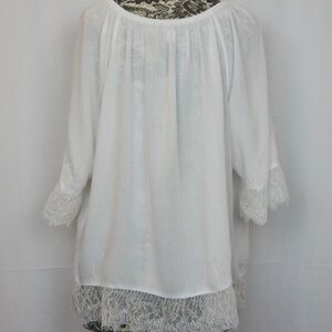 This is a beautiful, comfortable top by INC. It is 100% Rayon and edged in a gorgeous delicate lace that is 100%Nylon.Light weight and breezy, this top will be perfect this summer.