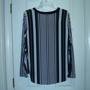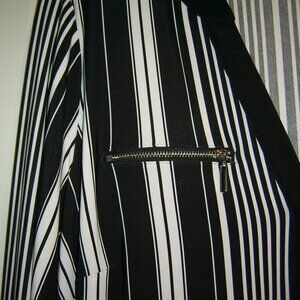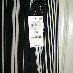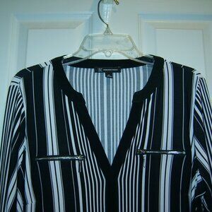 INC Woman Black & White Stripe V-neck Top Blouse that is NEW WITH TAGS. The blouse has a comfortble feel with polyester and spandex blend. There are two faux zipper pockets at upper chest. The size is ladies size 0X, with a chest measurement of the blouse of 45" (please measure for accuracy of fit). There is an attached original price tag of $74.50. Please view the photos for details. Smoke and pet free home.