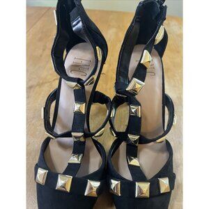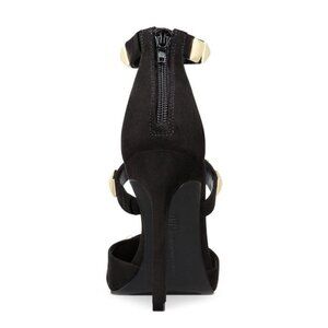 Elegant black strappy stiletto heels with studded details and a chic pointed toe design. Perfect for a night out or formal event. Stylish and comfortable, these shoes feature a convenient zip-up closure for easy wear.