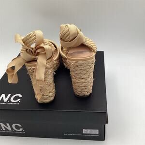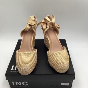 Elevate your summer style with the INC International Concepts Espadrille Sandal. Crafted with a chic woven texture, these beige sandals feature a comfortable mid-height wedge heel, perfect for all-day wear. The lace-up design adds a touch of elegance, making them ideal for casual outings, beach days, or a relaxed brunch with friends. The woven upper material ensures breathability, keeping your feet cool and comfortable during warm summer days. New in box.
