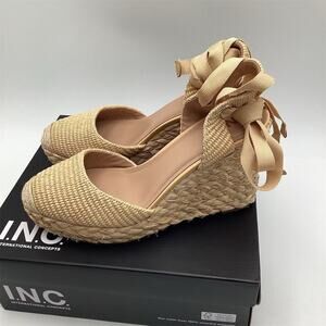 Keywords: espadrille, wedge sandal, lace-up, summer footwear, casual sandal, woven texture, beige sandal, women's shoes, mid heel, summer style, breathable, comfortable, beachwear, brunch outfit, INC International Concepts.
