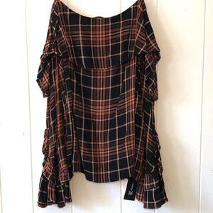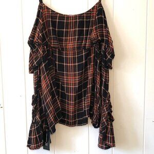 INC Womens Orange & Black Plaid Cold Shoulder Top Small
