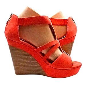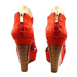 Crafted with elegance, these red platform wedge sandals feature a strappy suede design and secure back zipper.