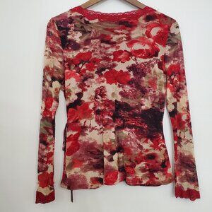 INC Womens Red Floral Lace Trim Side Tie Blouse Size M V Neck Whimsigoth Y2K