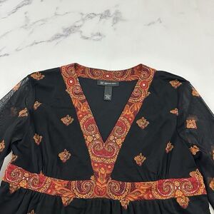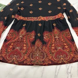 INC Womens Vintage Y2k Babydoll Top Size L Black Orange Paisley Mesh Sheer Trim