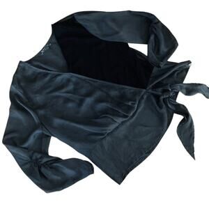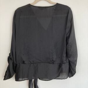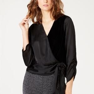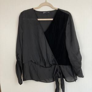 -black faux wrap blouse with velvet front panel, black chiffon body, and decorative tie detail at hip