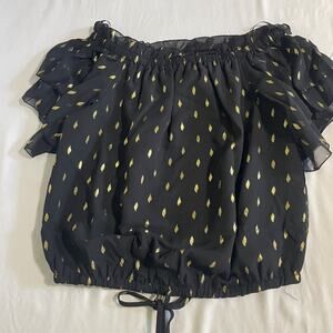 Foil Print, Tiered Sleeve, Off Shoulder Top, Womens XS, NWT, Lightweight, Chic, Stylish, Trendy, Summer, Gold Foil Print, Machine Washable, Versatile, Date Night, Casual Chic, Blouse.