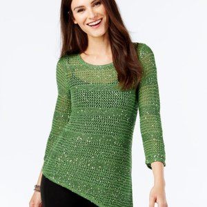 Elegant, stunning and slimming with an assymetrical hem! Scoop neck holiday sweater by INC. International Concepts. This sweater has little holes and works best with a tank or camisole. Small silver sequins throughout.