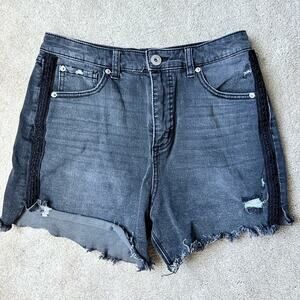 INC black distressed denim shorts size 6. Raw hem. Side stripe black lace detail. Pockets. Zipper closure. Good condition denim shorts.