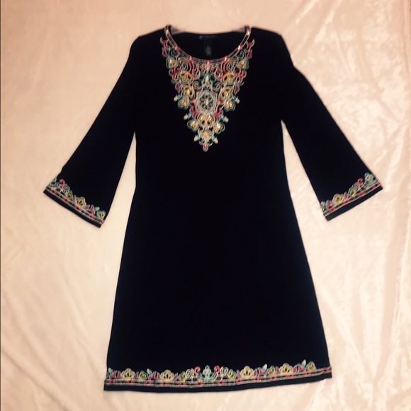 Black dress fits small or medium size. Multi colored beaded top and accent on sleeve and hem. Just enough stones for subtle shine, elegant