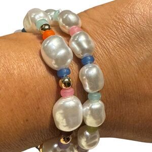 This elegant bracelet features lustrous white pearls complemented by colorful beads. Perfect for adding a touch of sophistication to any outfit.