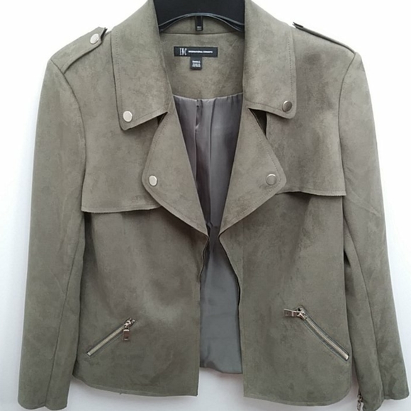INC jacket from Macys. Sage green color with silver metal details. Zipper pockets and zipper detailing on sleeves. In great condition, no stains rips or tears.