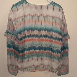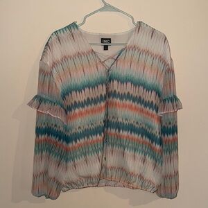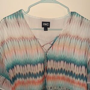 Bring color and style to your wardrobe with this beautiful I.N.C. International Concepts multicolor peasant blouse in size Large. Featuring a vibrant zig-zag/ombre print in teal, coral, white, and peach tones, this lightweight top is perfect for spring, summer, and vacation looks.