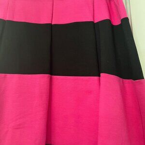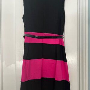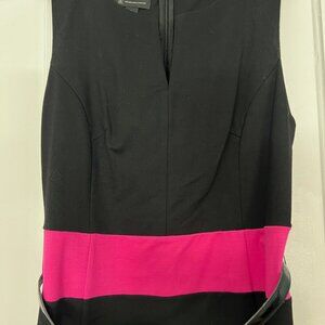 INC black and fucshia pink dress with faux patent leather black shiny belt. Size large. Approximate measurements are: Bust underarm to underarm 18", waist 16" and length 38.5". The dress does have a bit of about one inch of stretch.