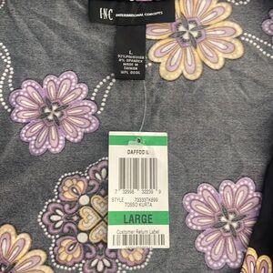 INC short sleeve 92% polyester 8% spandex so it has some nice stretch. New
