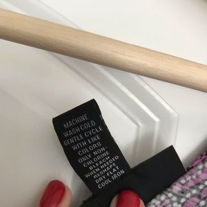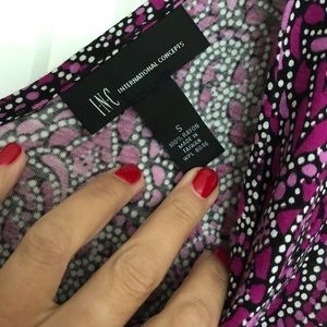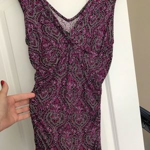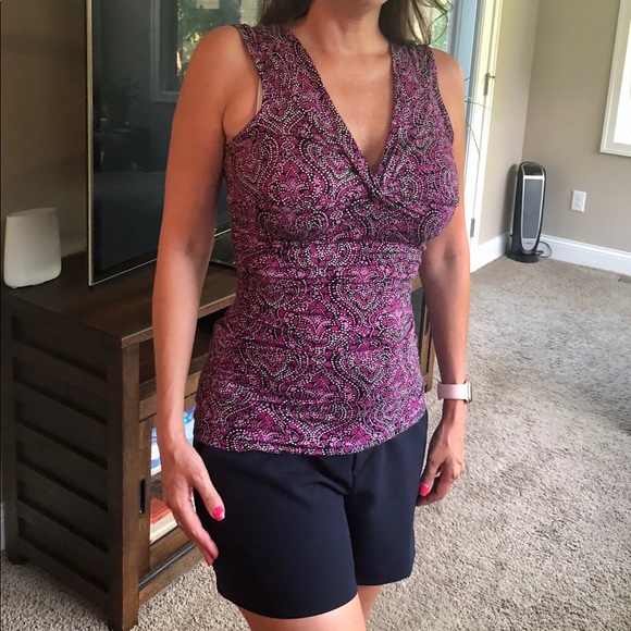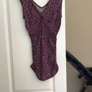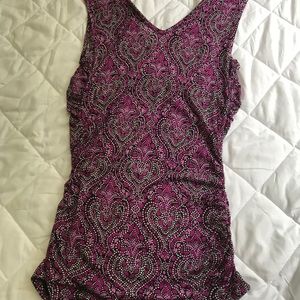Ruched sides, fits smallish/fitted. Deep V neck & very unique pattern. Probably worn only a few times.