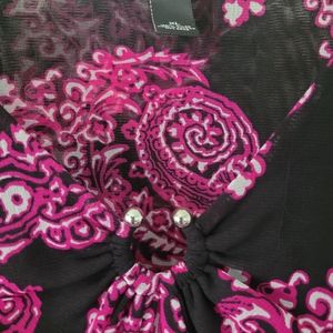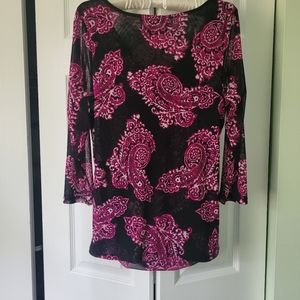 INC super cute magenta and black long sleeve top. Very lightweight, front is fully lined. Round metal adornment at the v point.