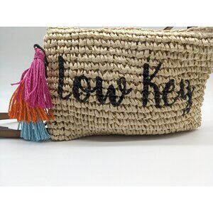 Natural straw with the words LOW KEY printed at front and accented with 3 colorful tassels on the side. Small crossbody style.