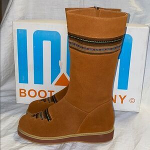 Made in Peru, rich caramel colored suede exterior embellished with Peruvian multicolor woven textile on the vamp and shaft, size vertical zipper on inner shaft for easy on off application, clay red colored foam sole with gum rubber nonslip bottom. 13” from floor to top of shaft, 14” circumference at top of shaft when zipped and 12” around the ankle, 1” sole at the heel. Brand new with box, size 7.