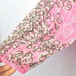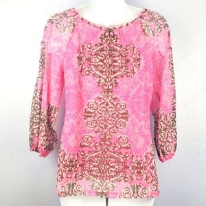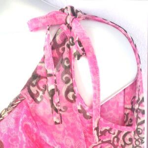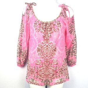 Feminine print blouse has cut out shoulders with ties. Lined with metal detail. In great condition.
