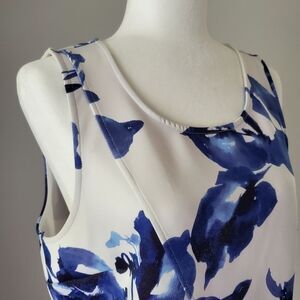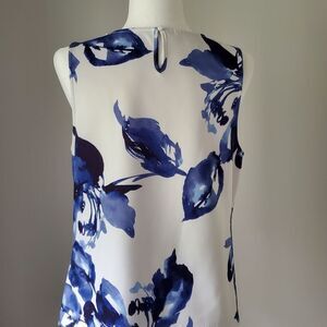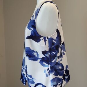 Sleeveless blouse with bold blue floral print. Asymmetrical hem adds style.