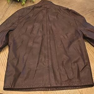 Stylish dark brown burgendy leather jacket with zip pockets. Ideal for casual outings. Comfortable and versatile.