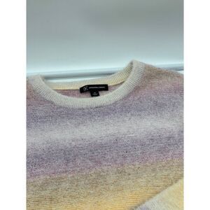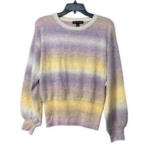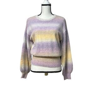 This ombre striped sweater offers a soft knit construction ideal for casual or semi-formal settings. Its crewneck design complements the subtle yellow and purple hues.