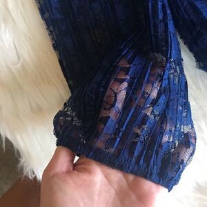 INC International Concepts Size Small Blue Lace Cold Shoulder Blouse; sheer lace arms, fully lined bodice. Pristine condition.
