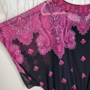 Dress Casual, Blouse, Attached Adjustable Strap Shell, Sheer, Paisley, Black, Pink, Print, Poncho Style, Stretch Waist, Formal,