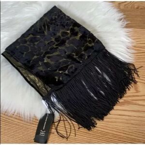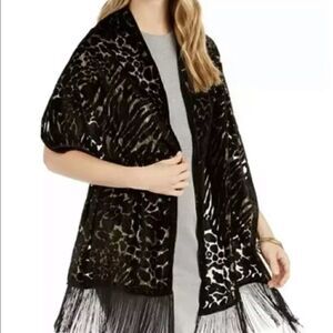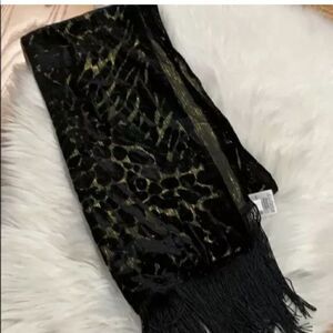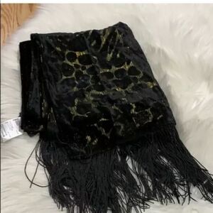 Animal print in velvet texture with accents of gold metallic lines add elegance to this wrap finished with a long fringe.