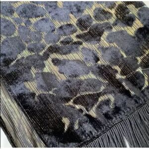 Finished with a 5 inch fringe. The combination of the fabric and textures gives it a multi-dimensional look waving colors of black and gold.