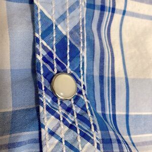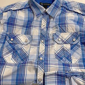 INC Mens Classic Fit Plaid Button Down - Size (M) Blue/White Plaid with white buttons and front pockets. Good Condition, normal wear