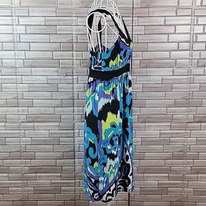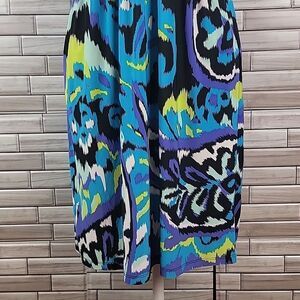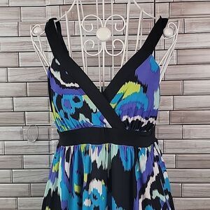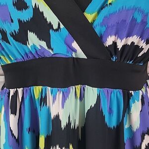 Polyester spandex blend comfortable stretchy pull on style mini dress by I-N-C. Bold colors in an artsy print with a surplice neckline and an empire gathered waist. Great pre-owned condition