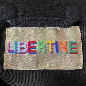 Spectacular, colorful, unique embellished military field jacket from Libertine. Alternating black and olive drab covered with embroidery, rhinestones, glittering thread - the works! Marked S, it measures 20" from pit to pit and 28" from collar to hem. It weighs in at 2lb 9oz. Excellent condition as shown in the photos.