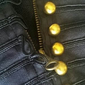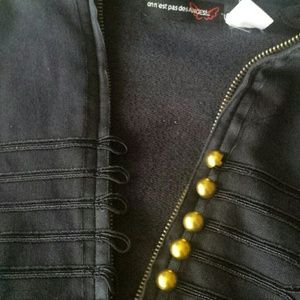 SUPER unique navy sweatshirt with band leader detailing, zipper closure and extra hook and eye detailing. SO fun to play with. Purchased in Paris but never worn, about size small.