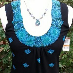 Brilliant blue against black creates a stunning dress, that is so simple and comfortable you'll wear it again and again. Placed paisley design on the hem and neckline. 100% nylon. Pull over style, gathers under neckline. Size small/4 measures 34 at chest, 32 at waist, 38 at hips, 37 long from shoulder to hem. I'm showing on my size 6 mannequin. Looks great!