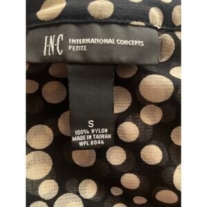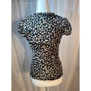Lovely short sleeve blouse by INC in size small. It has a button front with a small ruffle around the neckline and plackart. Black with tan polka dots.