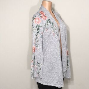 INC International Concepts' shawl-collar cardigan is casually elegant with bell sleeves and embroidered floral accents.
