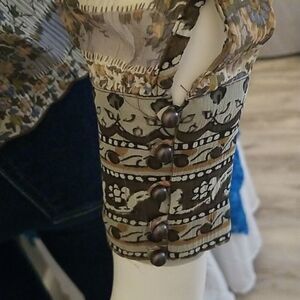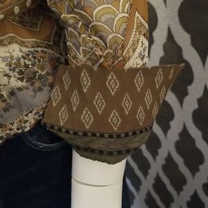 Muted browns, greens and creams in multiple patterns. Sleeves can be worn buttoned or rolled up showing the contrasting pattern on the inside. Tie front at neckline. Smoke free home.