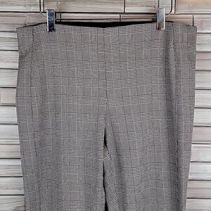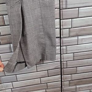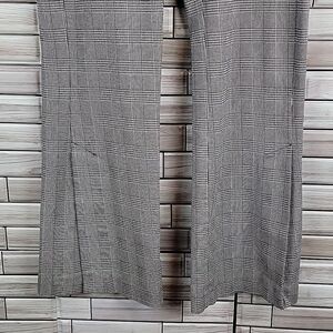 Rayon nylon spandex blend white and black checkered stretchy fabric on this midrise pull on pant. A fun sleek look with wide elastic waistband for comfort and a flare leg with slit. Great pre-owned condition
