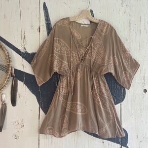 INDAH Paisley Print Mini in blushing pink and nude tone, is a 100% Rayon for the a super soft, lightweight airy dress perfect for super warm days! Featuring bell sleeves, V-neck crisscross straps that can be left open or tied. Empire elastic waist. This trash was on continuous rotation in my closet during the super hot months styles with gladiator sandals, or Birkenstocks. As a beach or pool cover-up. This is a PULL ON DRESS!