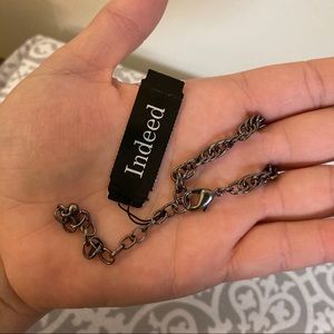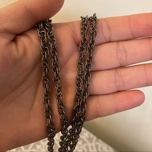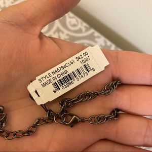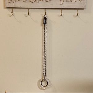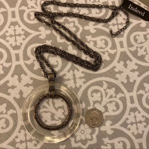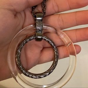 This is NWT 20” necklace featuring a lobster clasp and a 3” extender and a 3” wide charm of a lucite ring with a high polish textured ring inside of it. The bale is also textured and has 3 openings to accommodate both rings and the necklace itself. The lucite has some small scratches on it from being stored in my jewelry box. Also the lobster clasp is a bit hard to open but not broken.