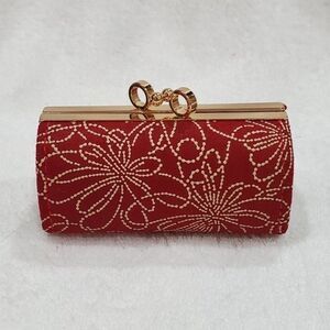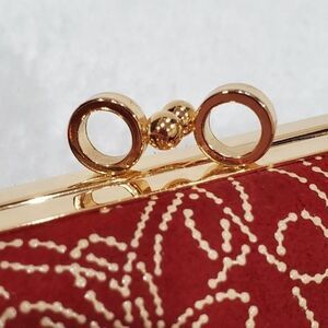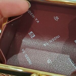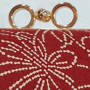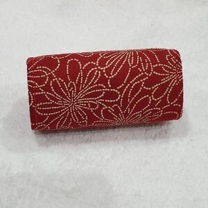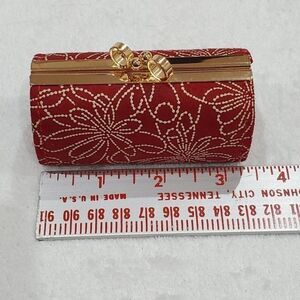 INDENYA Japanese dark red leather lipstick case with a gold kiss lock gamaguchi closure. Metal W construction for uptimum movement to open and close. Lined with deerskin EP leather from for pure luxury. Cream floral Hanko stamp design.
