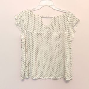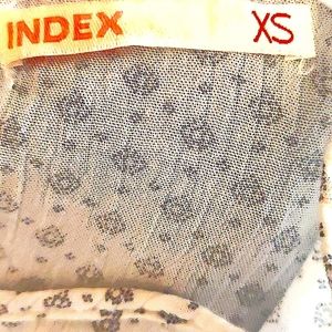 INDEX loose-fit short top in soft viscose. Short wing sleeves. Round neckline. Back fastening with one button. Coquette front and back. Decorative finishing - multi-colired lines. Nice condition.