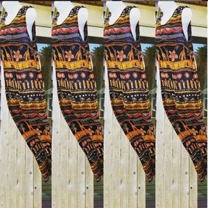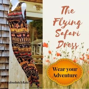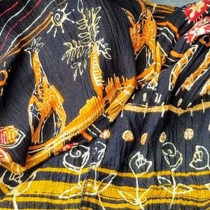 ABSOLUTELY once this exquisitely woven 100% Indian rayon crinkle dress slipslides your torso ~ a heightened sense of ADVENTURE readies take off. (May fly if you catch right breeze or flight) Bold red/gold art dress of giraffes, flowers, symbols and graphic shapes upon deep black must be seen (worn). * Amazing Gazing to ensue, at You. Add snappy sandals, bangly bracelet and golden necklace. Go Girl!