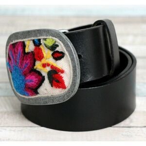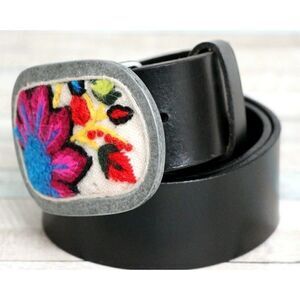 INDIA BLACK GENUINE LEATHER 1.75"Wd EMBROIDERED BUCKLE WOMEN'S BELT Sz S/M (T67