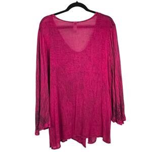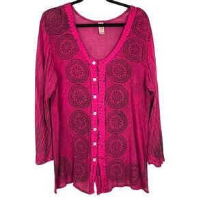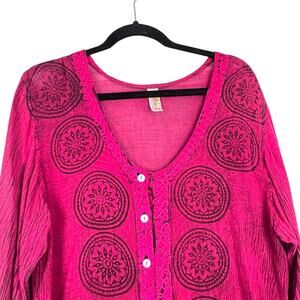 INDIA BOUTIQUE Boho Crinkle Cotton Embroidered Button Front Tunic Bell Sleeves
