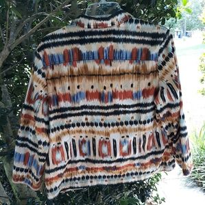 A1081. Talk about prime vintage- all the wonderful fall colors brushed on the surface of this lightweight cotton jean-style jacket just call for statement and style! Pair it open or closed with jeans, a peasant skirt, or with leggings under a tulle skirt. It screams ARTSY and would be a great fall festival companion! It features two waist pockets, metal buttons and grommet chest tabs. Sleeves are 3/4 length and can be rolled as well.