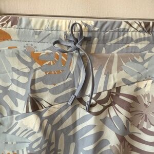 Size XS, recycled polyester and spandex blend, floral pattern, matching top and skort, top has waist tie, scoop neck, cap sleeve, pull on. Skort is pull on, elastic waist with drawstring, skort, built in shorts, side pockets, 1 zip hip pocket, short length.